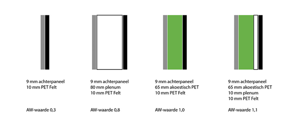 – 10 mm PET Felt met akoestisch PET van 65 mm en een lucht plenum van 10 mm = AW-waarde 1,1